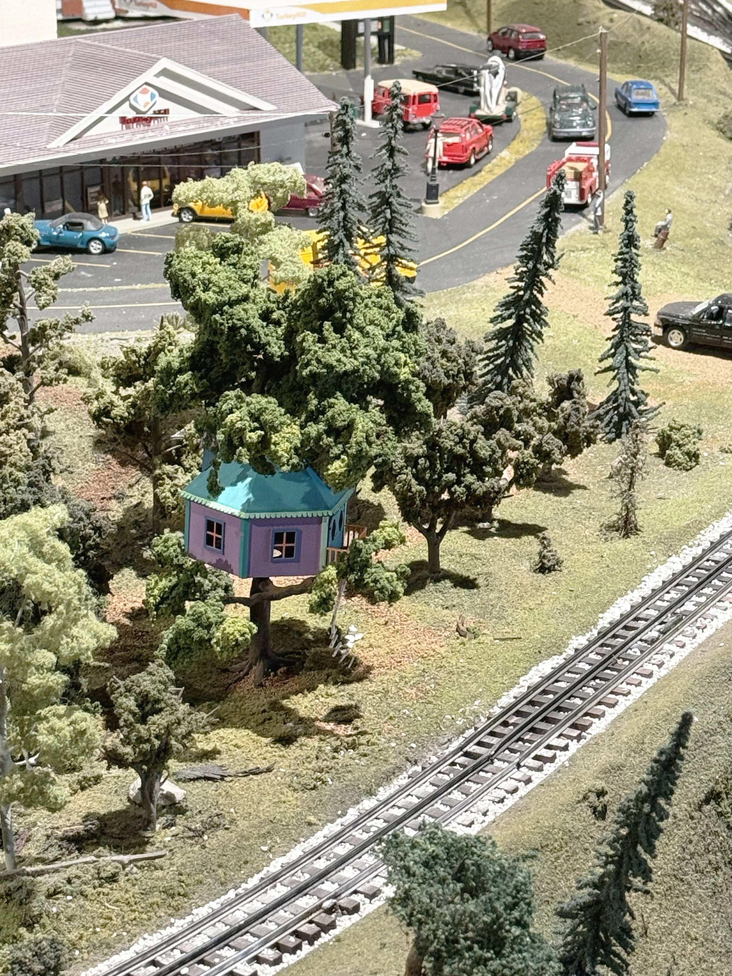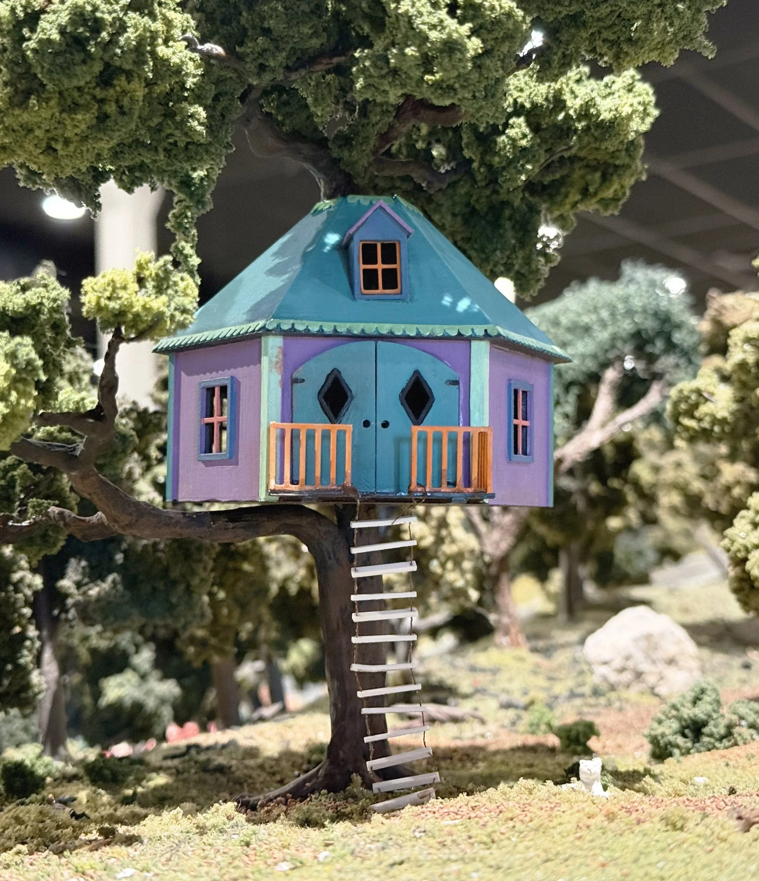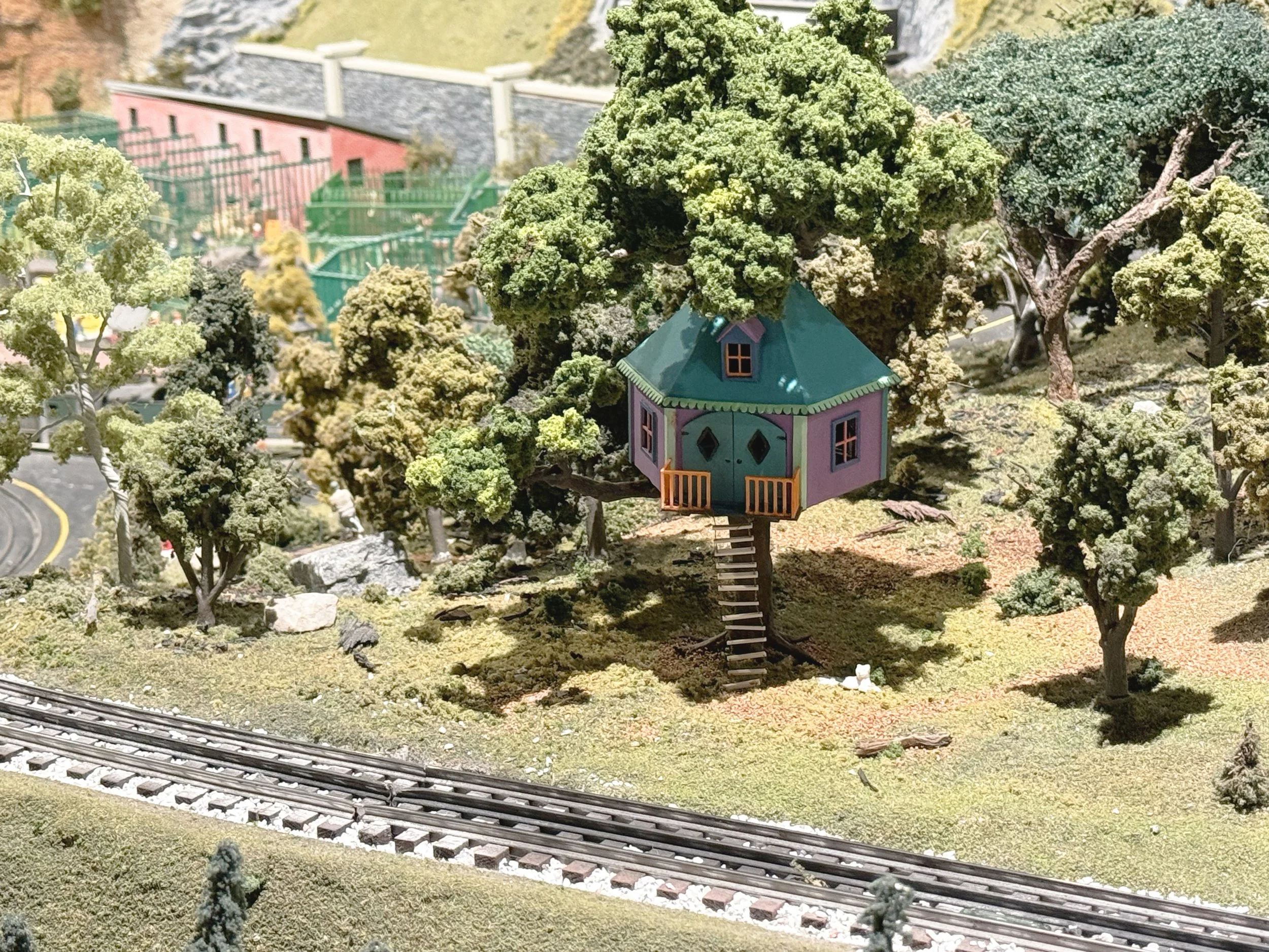 Tucked among the plastic trees, this tiny treehouse was thoughtfully crafted for the Choo Choo Barn, a miniature train attraction in Strasburg, PA. The tree is made from clump foliage, clay, and wire, while the house consists of plastic and string.